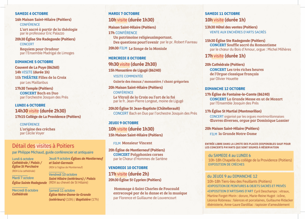 – des visites de monuments, églises – des expositions d’objets, de peintures et de sculptures – des expositions d’artisans – des expositions de crèches – des conférences – des concerts soli, chœurs et orchestres – des danses – des projections de films – des ventes d’oeuvres d’art par les Commissaires-Priseurs, Antiquaires et Brocanteurs